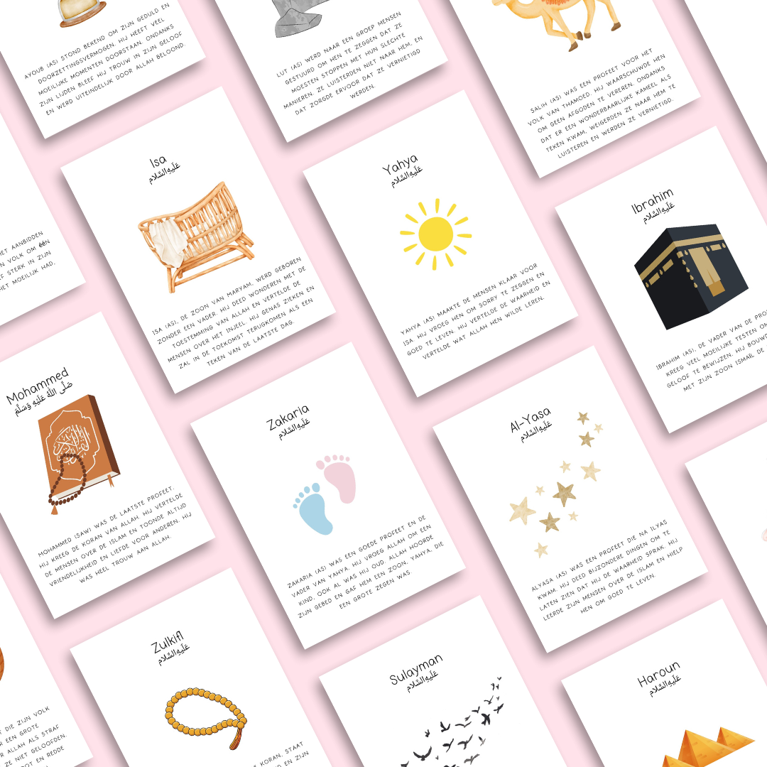 Elke kaart bevat een korte en duidelijke uitleg over de profeet, zodat jonge kinderen de informatie goed kunnen begrijpen. De overzichtelijke opzet maakt de kaarten ideaal om samen te lezen, te leren en te bewaren.
